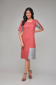 A knee-length shift dress featuring a round neck, contrast detailing, and half sleeves. Crafted from breathable organic hemp, it offers a clean silhouette with all-day comfort and effortless elegance.